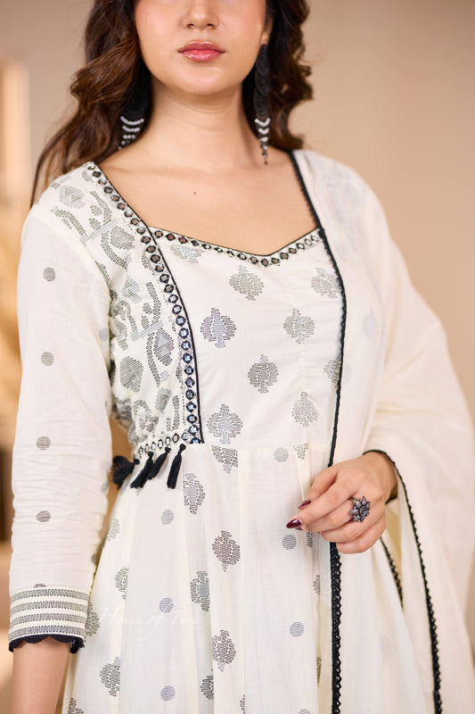 White and Black Ikkat Print Anarkali Set with Mirror Detailing - Timeless Elegance