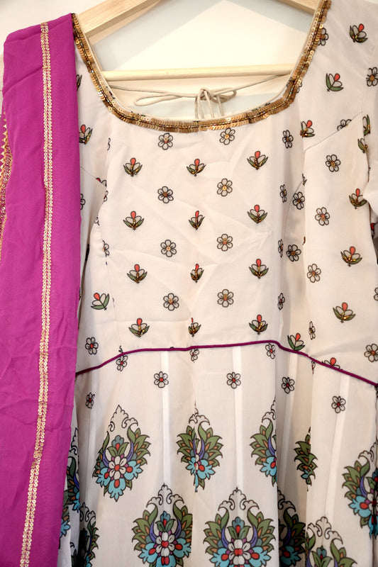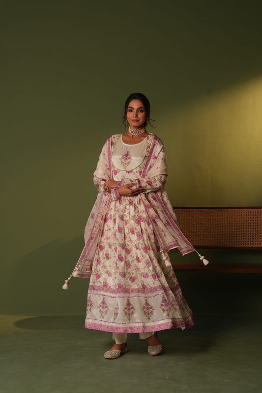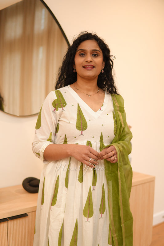 White Cotton Block Print Anarkali with Kota Doria Dupatta
