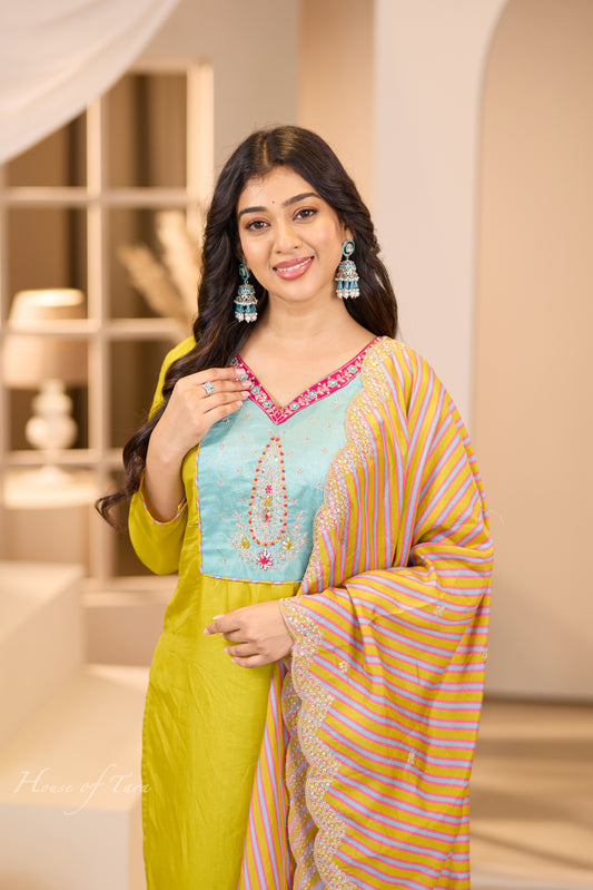 Silk Kurti Set with Contrasting Neckline and Designer Dupatta