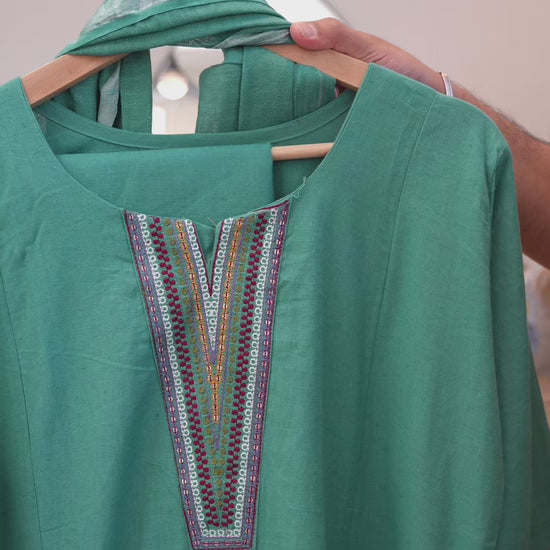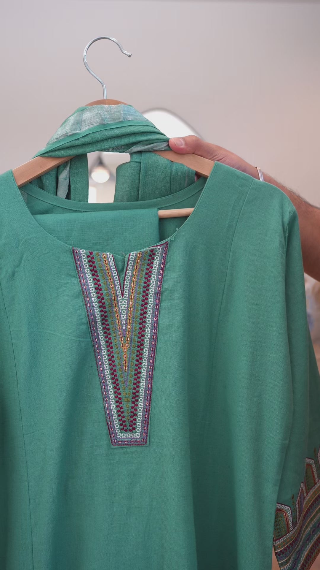 A refreshing aqua-green kurti that radiates cool sophistication. The deep V-panel is richly detailed with multicolor thread embroidery in maroon, mustard, and ivory, framed by subtle mirror-like accents. Crafted for both comfort and charm, it’s a perfect pick for everyday wear with a touch of traditional artistry.