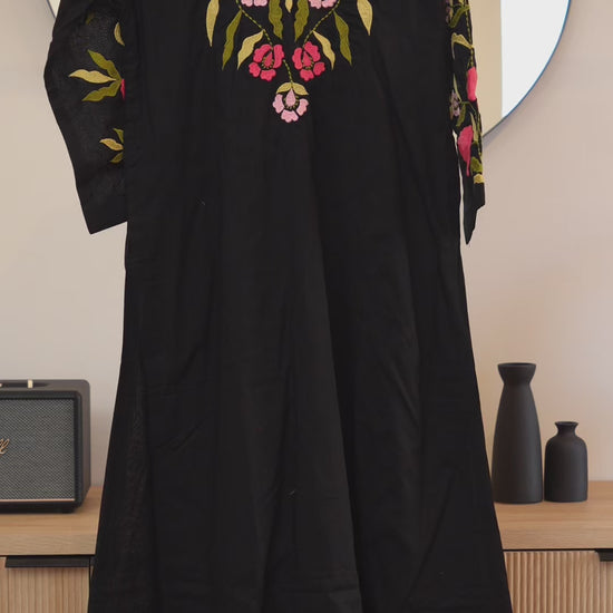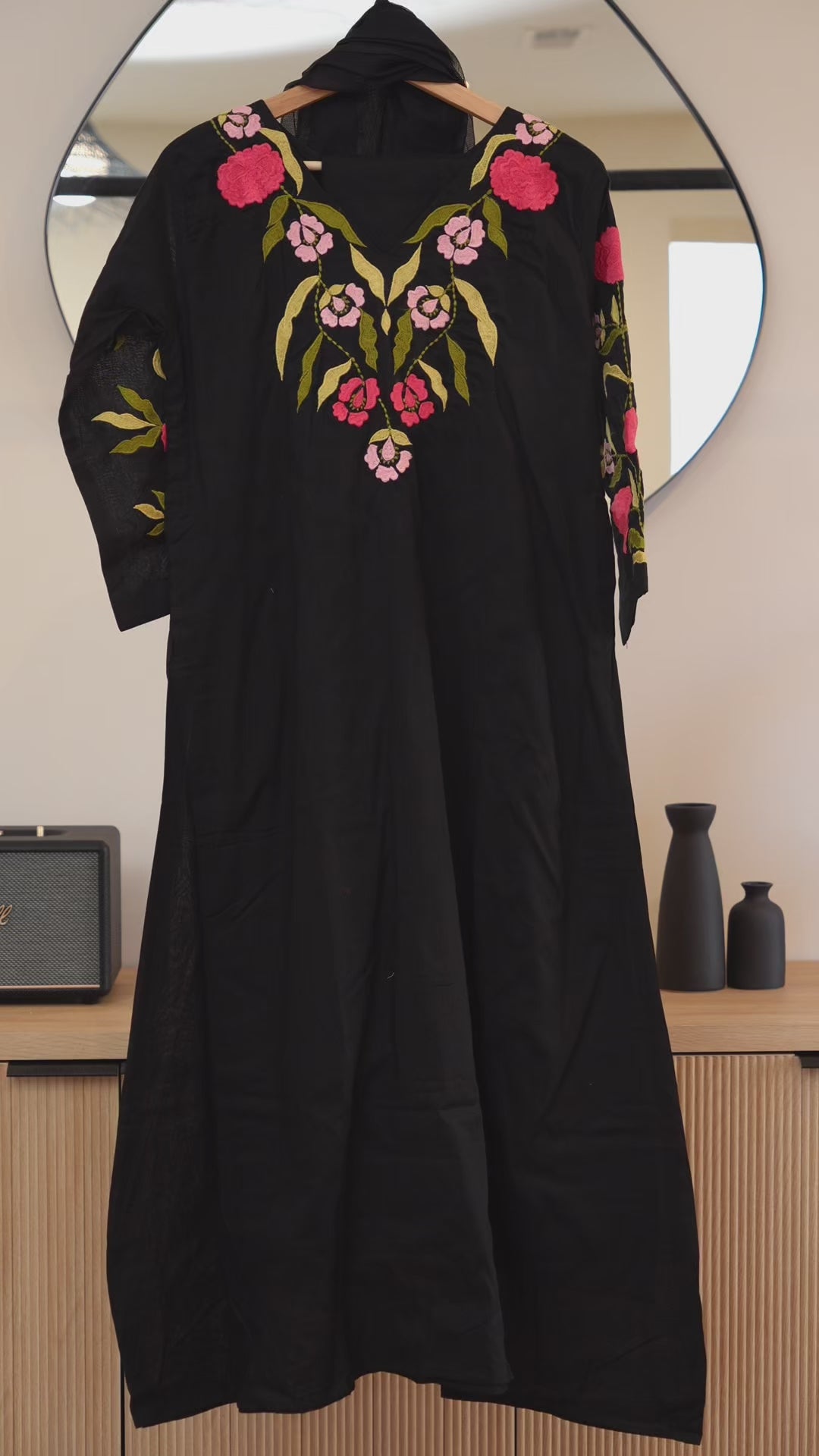 A chic black kurti adorned with beautiful pink and red floral machine embroidery for an elegant, standout look.