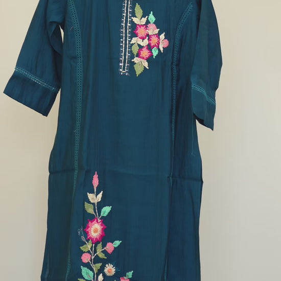DESCRIPTION: A classy navy blue kurti set featuring vibrant multicolor floral embroidery and elegant detailing for a standout ethnic look.