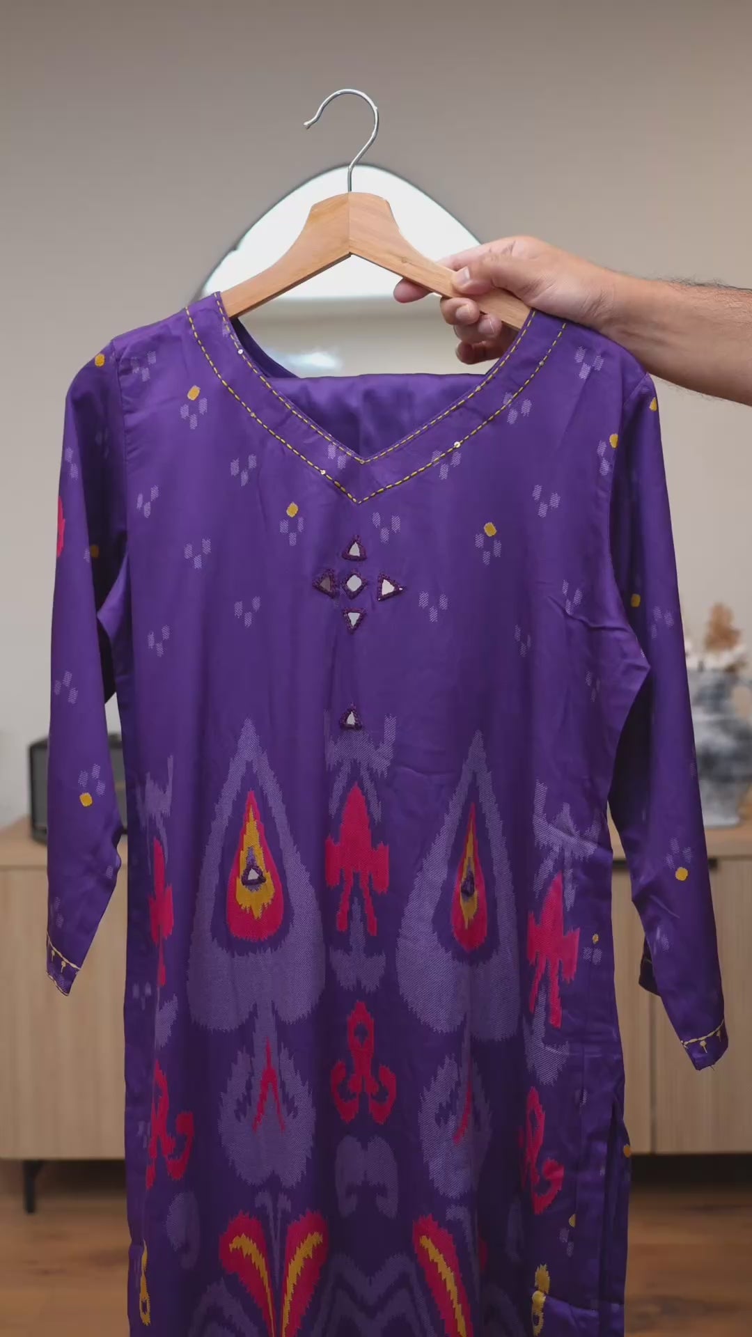 A stunning deep purple kurti set accentuated with yellow thread detailing and delicate mirror work, adding a touch of traditional sparkle to elegant everyday style.
