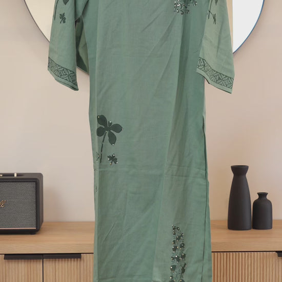 A graceful green kurti adorned with detailed machine embroidery for a stylish and timeless appeal.