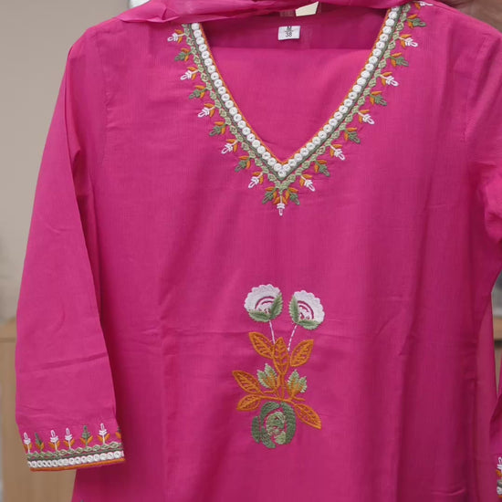 Step into elegance with this soft pink kurti set, beautifully detailed with fine machine embroidery.