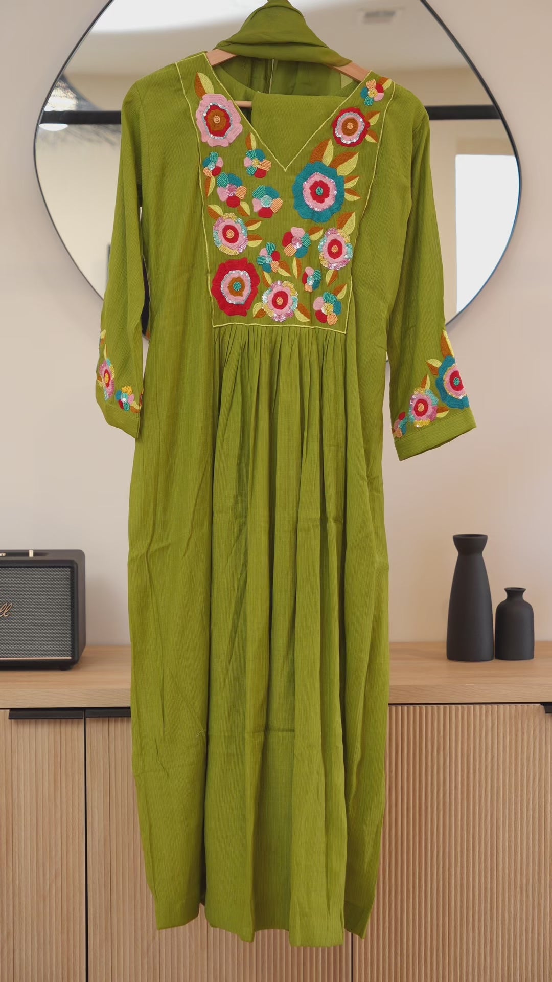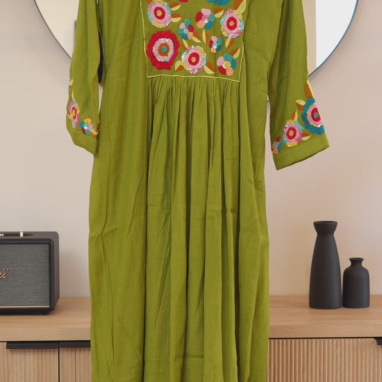A vibrant olive green kurti richly adorned with bold multicolor floral machine embroidery and sequins for a bright, festive look.