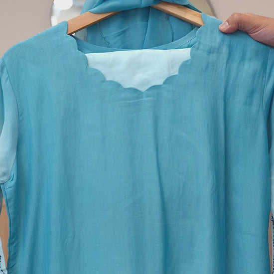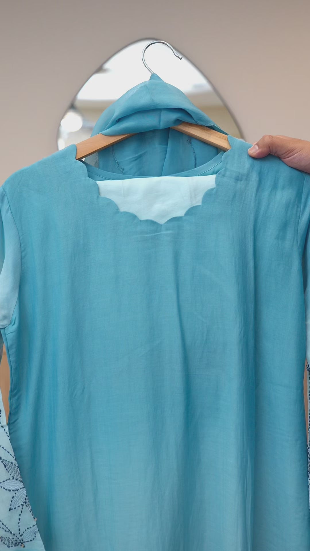 Ombre-shaded blue kurti set embellished with intricate French knot detailing for a serene and elegant finish.