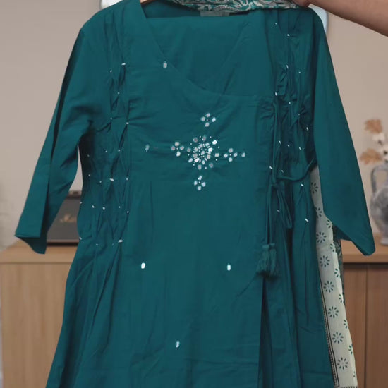 Shine with elegance in this peacock green kurti, accentuated by delicate mirror work.