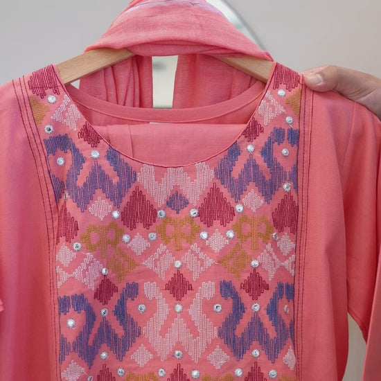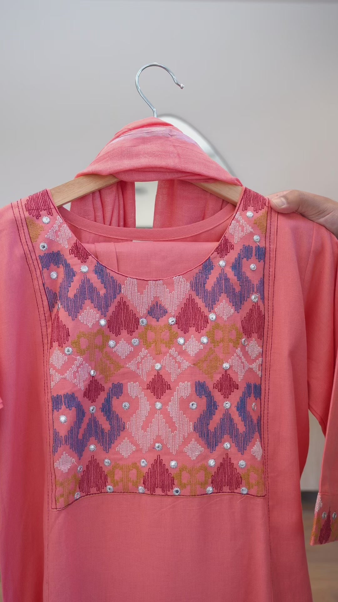 Vibrant Coral Ikat Cotton Kurti – Embellished Elegance