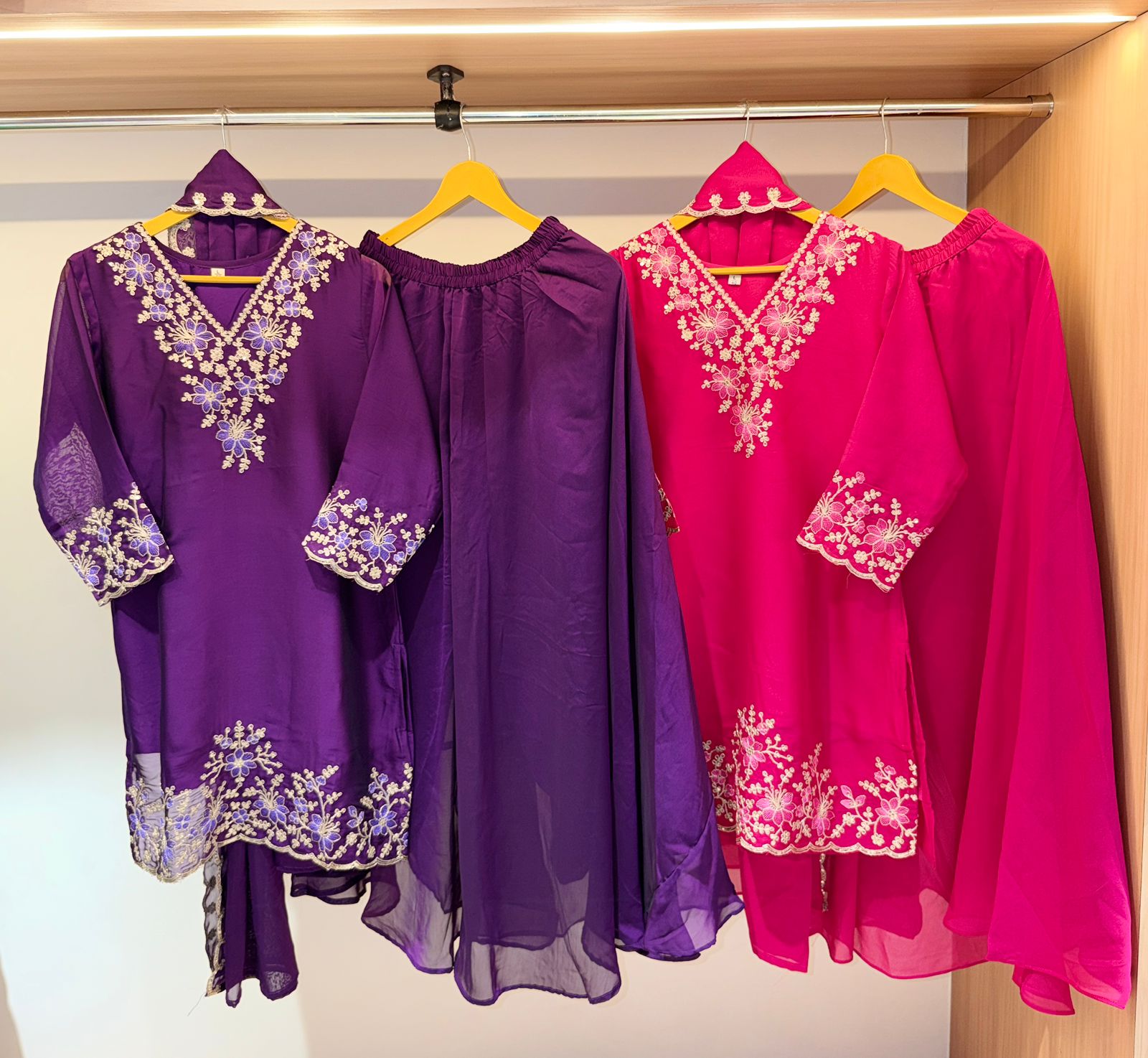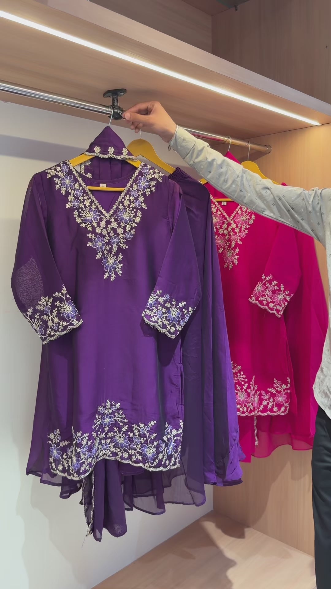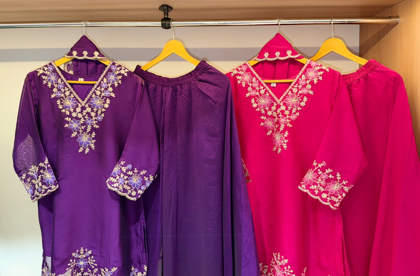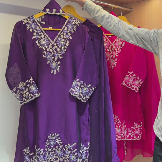 Graceful Mulchanderi 3-piece set featuring intricate machine embroidery on the yoke and designer detailing on the dupatta, available in green and elegant violet shades.