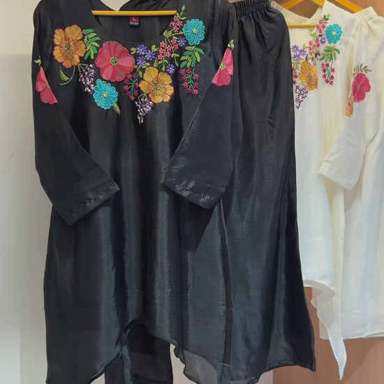 Luxurious pure Chinon apple-cut cord set adorned with elegant handwork and embroidery, paired with a stylish palazzo for a graceful contemporary look.