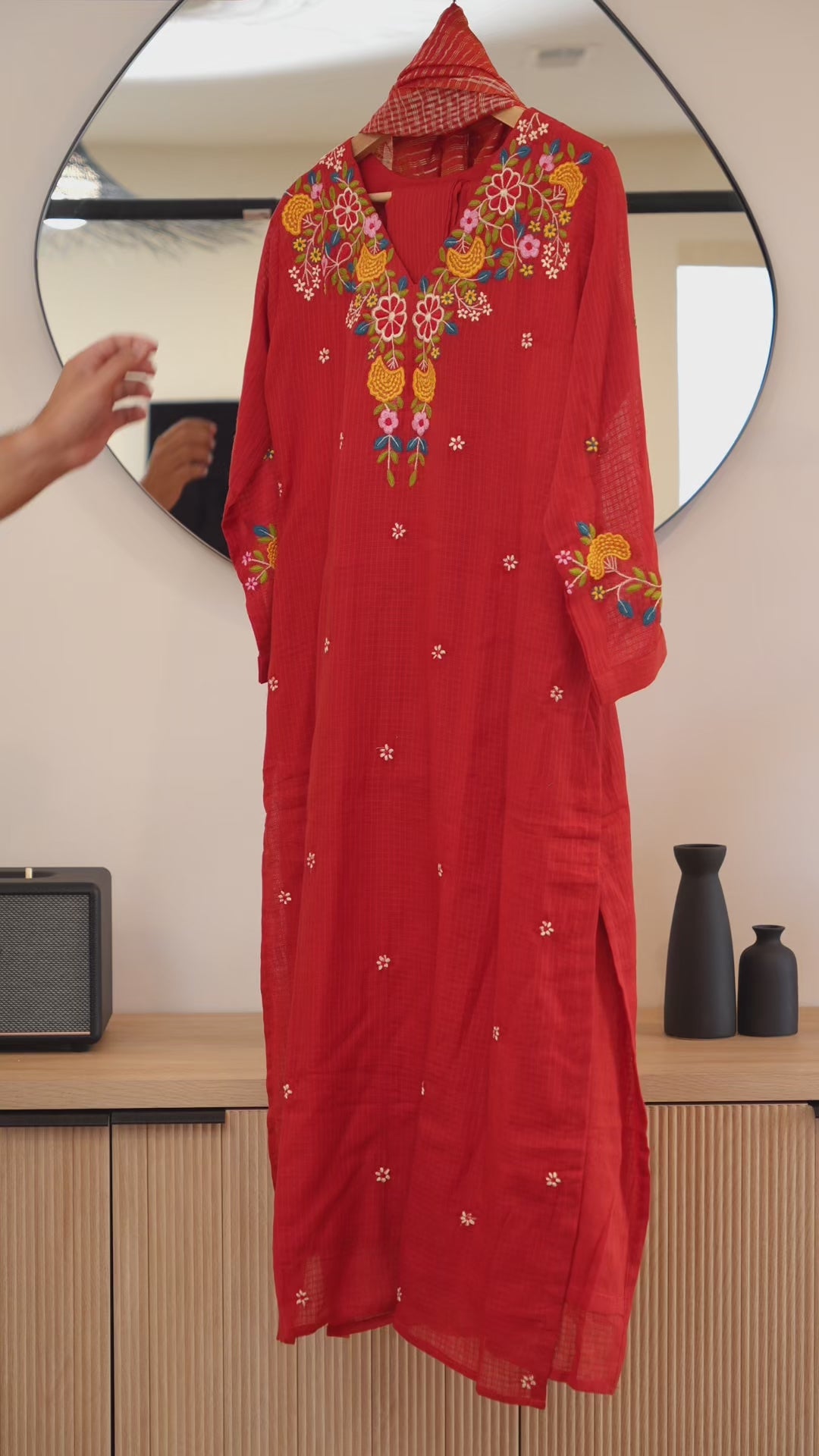 DESCRIPTION:A vibrant rust-red kurti beautifully detailed with bright multicolor floral embroidery for a cheerful and festive look.