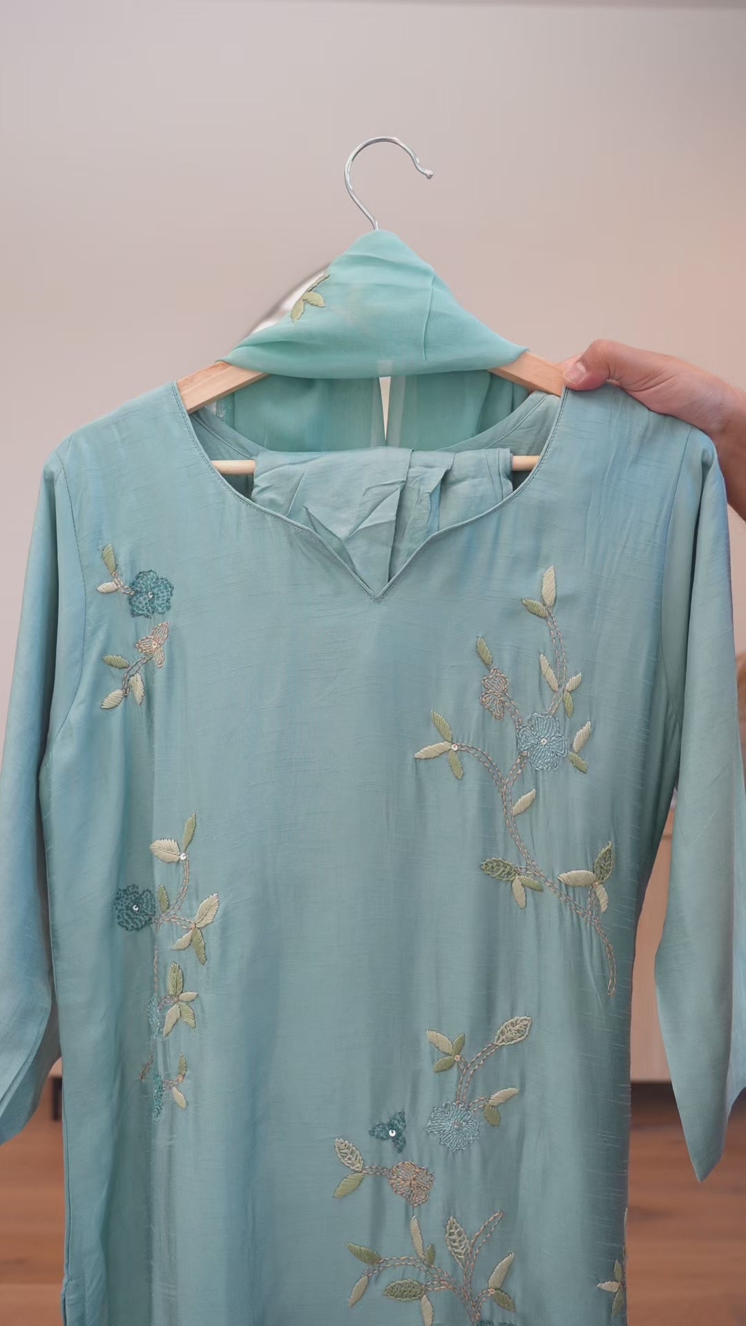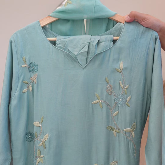 A soothing sage-green kurti with a subtle V-slit neckline, bringing a calm, breezy vibe. Delicate threadwork of soft beige and pastel green flowers with leafy vines trails gracefully along the side, adding a natural, airy charm. Ideal for relaxed daywear or an understated festive look.