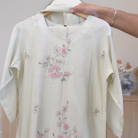 A graceful beige kurti that carries a quiet, timeless charm. The gentle V-neckline flows into delicate vine embroidery in soft pink and leaf-green, forming elegant blossoms along the front. Its pastel palette and airy fabric make it perfect for warm days, festive brunches, or serene evening gatherings, pairing easily with palazzos or churidars for an effortless classic look.