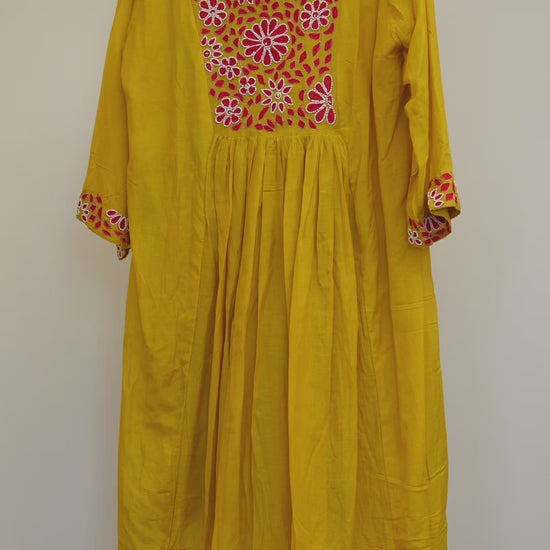 DESCRIPTION:A striking mustard yellow kurti set adorned with rich red floral embroidery, perfect for festive and statement ethnic wear.