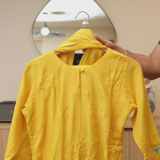 Woven in sumptuous Russian silk, this kurti set dazzles in a bright, lemon-yellow shade.Features refined self-tone machine embroidery along the yoke and sleeves for subtle, sophisticated texture.The fluid, lightweight silk drapes elegantly, ensuring comfort from day events to evening gatherings.Pair with statement stud earrings and nude or metallic sandals to complete a chic, contemporary look.
